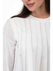 Округлый вырез горловины, обработанный притачной планкой - обтачкой, застежка-прорежка на спинке вверху. Втачные расширенные рукава со сборкой по откату и по низу на эластичной тесьме. По переду и рукавам нанесена россыпь маленьких камней.