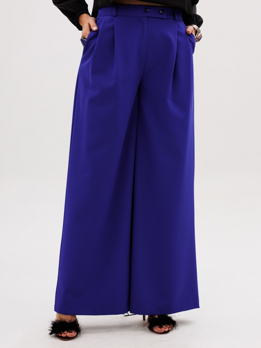 Элегантные брюки-палаццо с современным силуэтом. Модель отличается безупречным кроем с высокой посадкой, который подчеркивает талию и создает выразительный удлиненный контур. Широкие, ниспадающие мягкими складками штанины дарят образу воздушность и непринужденную пластику.