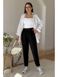 Брюки женские из трикотажной хлопковой ткани (двунитка), слегка заужены к низу. В боковых швах расположены карманы. По низу передних половинок есть защип. Задняя половинка брюк с отрезной кокеткой и накладными карманами. Вверх брюк обработан поясом с резинкой (без молнии).