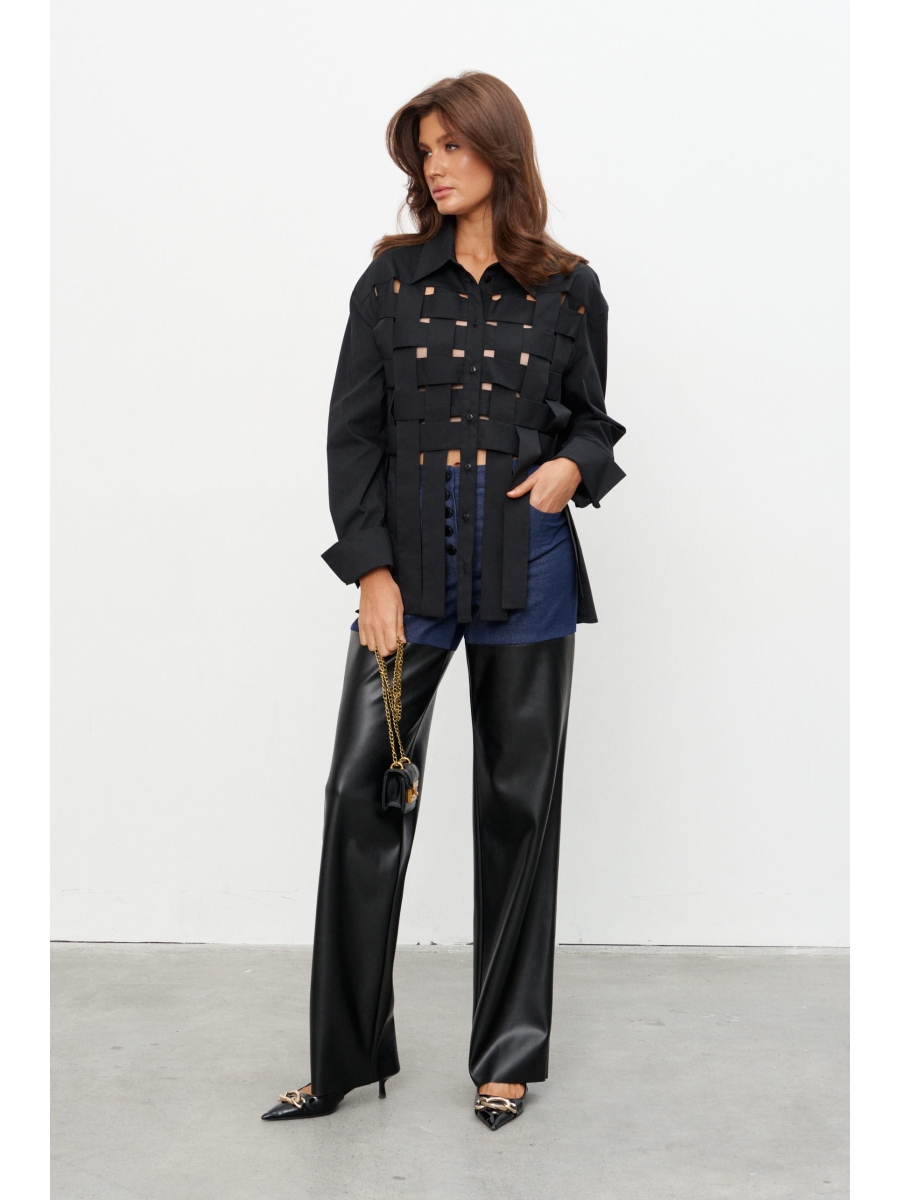 Оформить заказ →Брюки прямого силуэта выполнены на сочетании плотного джинса и экокожи. Брюки на поясе со шлёвками и застежкой на металлические пуговицы-болты. По переду два прорезных кармана, по спинке - два накладных.