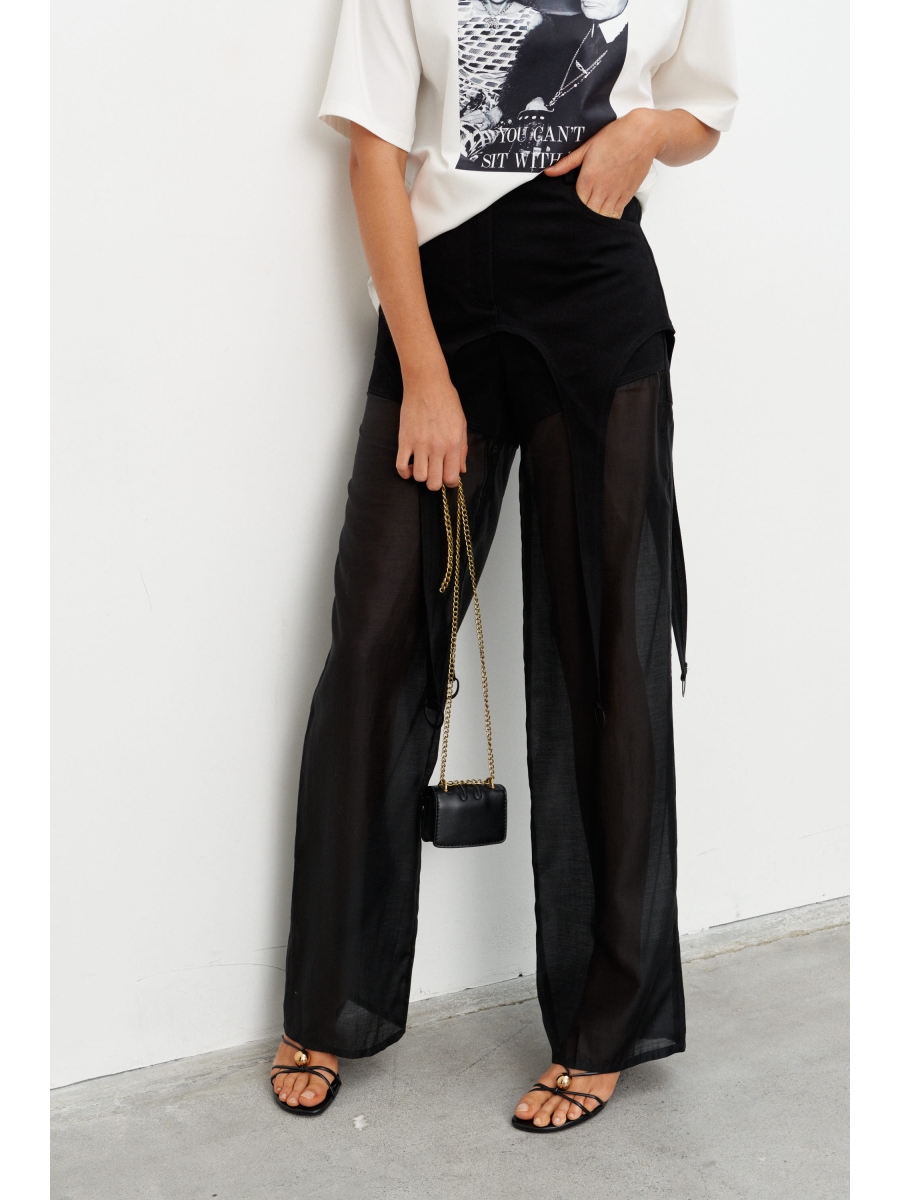 Оформить заказ →Брюки прямого силуэта с баской выполнены на сочетании плотного джинса и полупрозрачной вискозной вуали. Брюки на поясе со шлёвками и застёжкой на пуговицу-болт и молнию. Чуть ниже шва сидения идут подрезы имитирующие по форме мини-шорты. От подрезов вниз брюки выполнены из вуали. По переду два прорезных кармана, по спинке - два накладных.