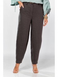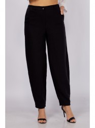 Брюки женские. Спереди застёжка на молнию и пуговицу. Сзади вытачки. В боковых швах карманы с отрезным бочком. Пояс по спинке на резинке, дополнен шлёвками. По низу брюк вытачки, создающие зауженный эффект.
