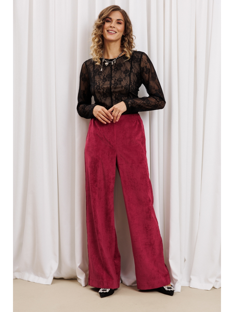 Оформить заказ →Брюки палаццо с притачным поясом из мягкой вельветовой ткани. Спереди застежка гульфик на молнии и петлей и пуговицей по поясу. По задней частям брюк вытачки. Пояс с резинкой в боковых частях. Брюки с заутюженными стрелками.