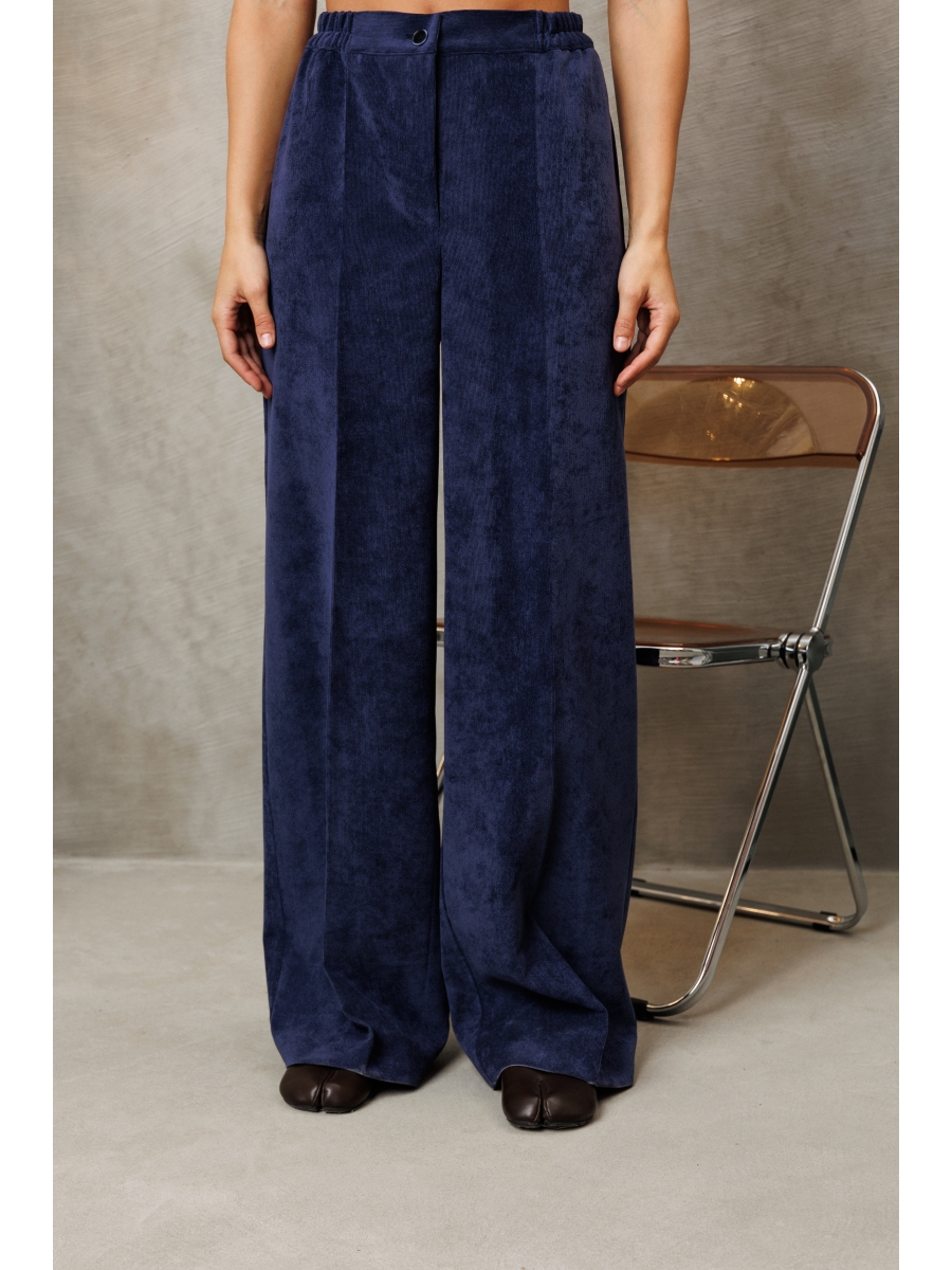 Оформить заказ →Брюки палаццо с притачным поясом из мягкой вельветовой ткани. Спереди застежка гульфик на молнии и петлей и пуговицей по поясу. По задней частям брюк вытачки. Пояс с резинкой в боковых частях. Брюки с заутюженными стрелками.
