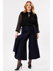 Модные брюки-кюлоты с элегантным запахом, свободной посадки, брючины широкие укороченные, чуть выше щиколотки. По переду молния, сзади по поясу вставлена резинка, запах фиксируется поясом на пряжке.