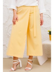 Модные брюки-кюлоты с элегантным запахом, свободной посадки, брючины широкие укороченные, чуть выше щиколотки. По переду молния, сзади по поясу вставлена резинка, запах фиксируется поясом на пряжке. С данными брюками можно смело создавать стильные комбинации с вещами Вашего гардероба.