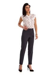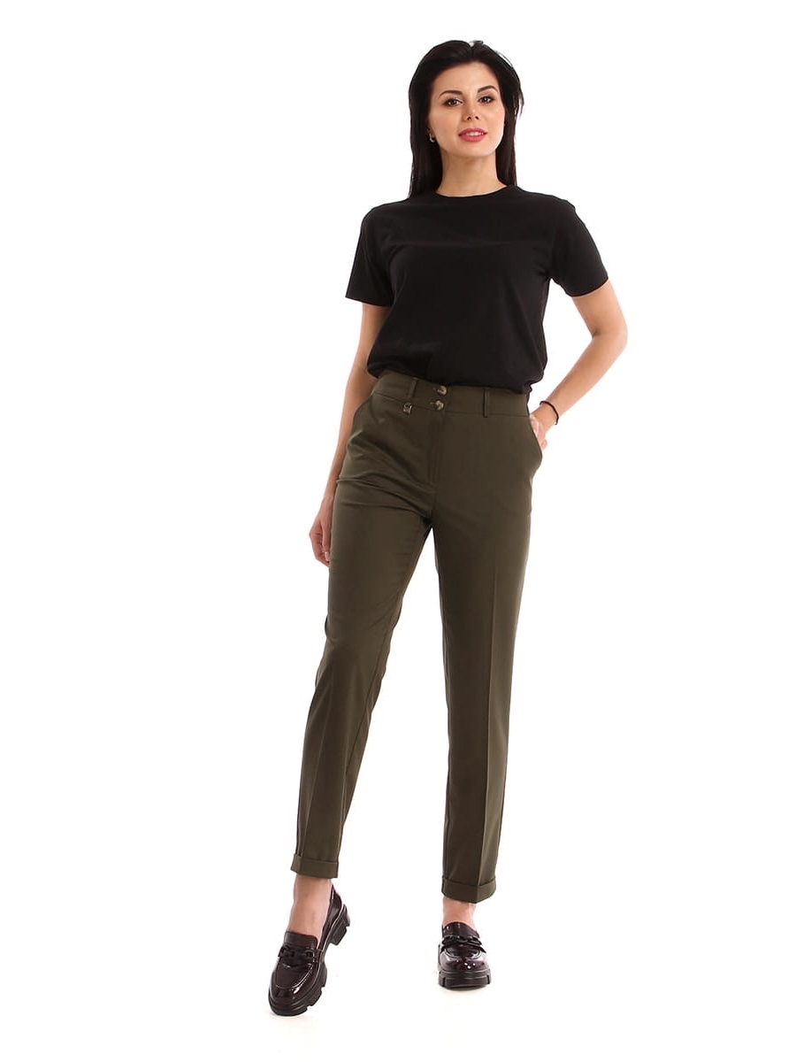 Брюки женские, заужены к низу. Посадка брюк высокая, пояс обработан с резинкой по бокам, низ брюк заканчивается манжетами. Застежка петля, пуговица, молния. По передним частям выполнены боковые карманы с прорезными бочками, по спинке талиевые вытачки с карманами имитацией и планками. Ткань достаточно хорошо тянется.