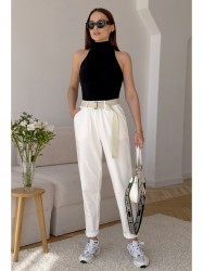 Брюки женские из трикотажной хлопковой ткани (двунитка), слегка заужены к низу. В боковых швах расположены карманы. По низу передних половинок есть защип. Задняя половинка брюк с отрезной кокеткой и накладными карманами. Вверх брюк обработан поясом с резинкой (без молнии).