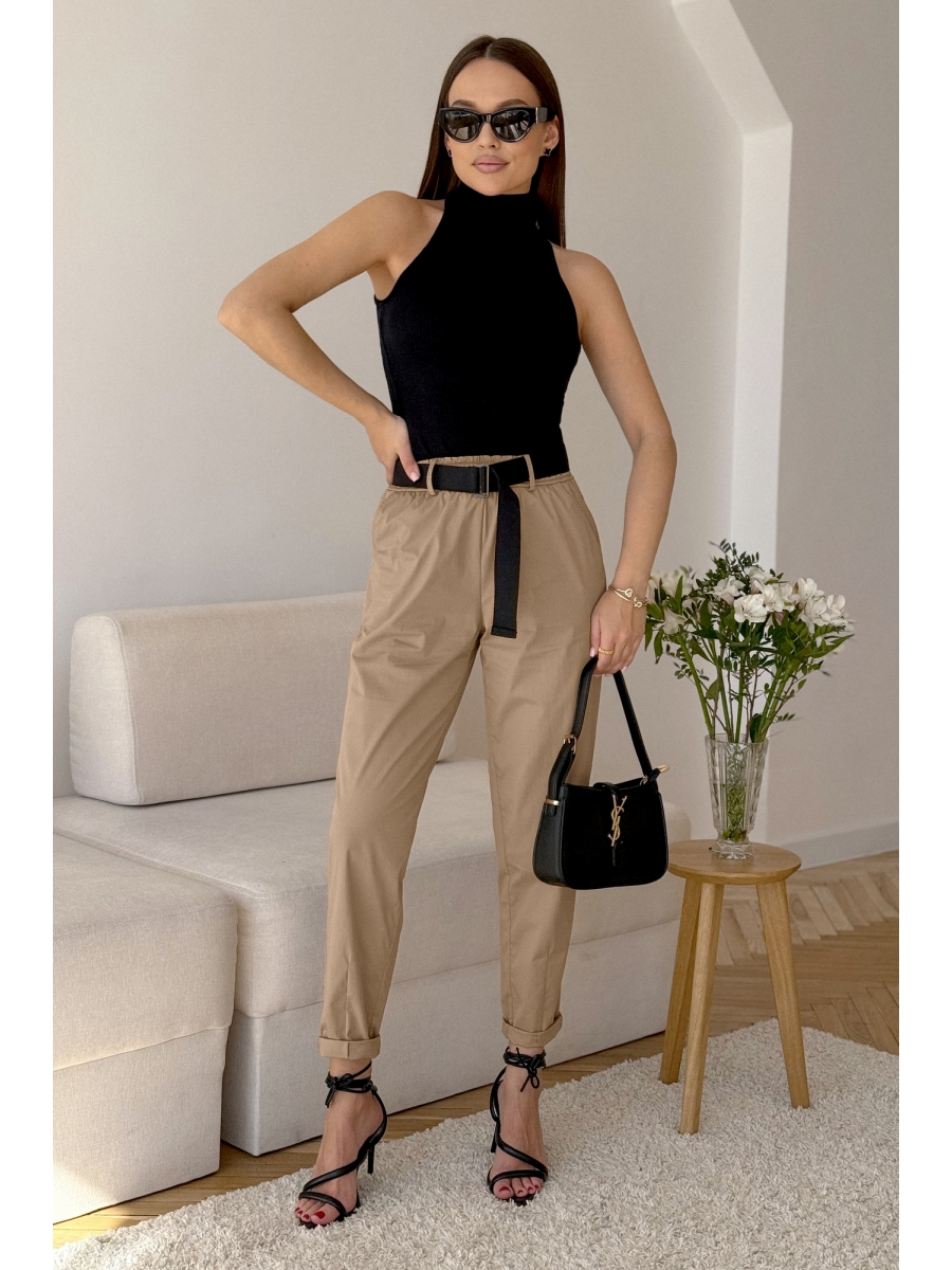 Брюки женские из текстильной ткани, слегка заужены к низу. В боковых швах расположены карманы. По низу передних половинок есть защип. Задняя половинка брюк с отрезной кокеткой и накладными карманами. Вверх брюк обработан поясом с резинкой (без молнии).