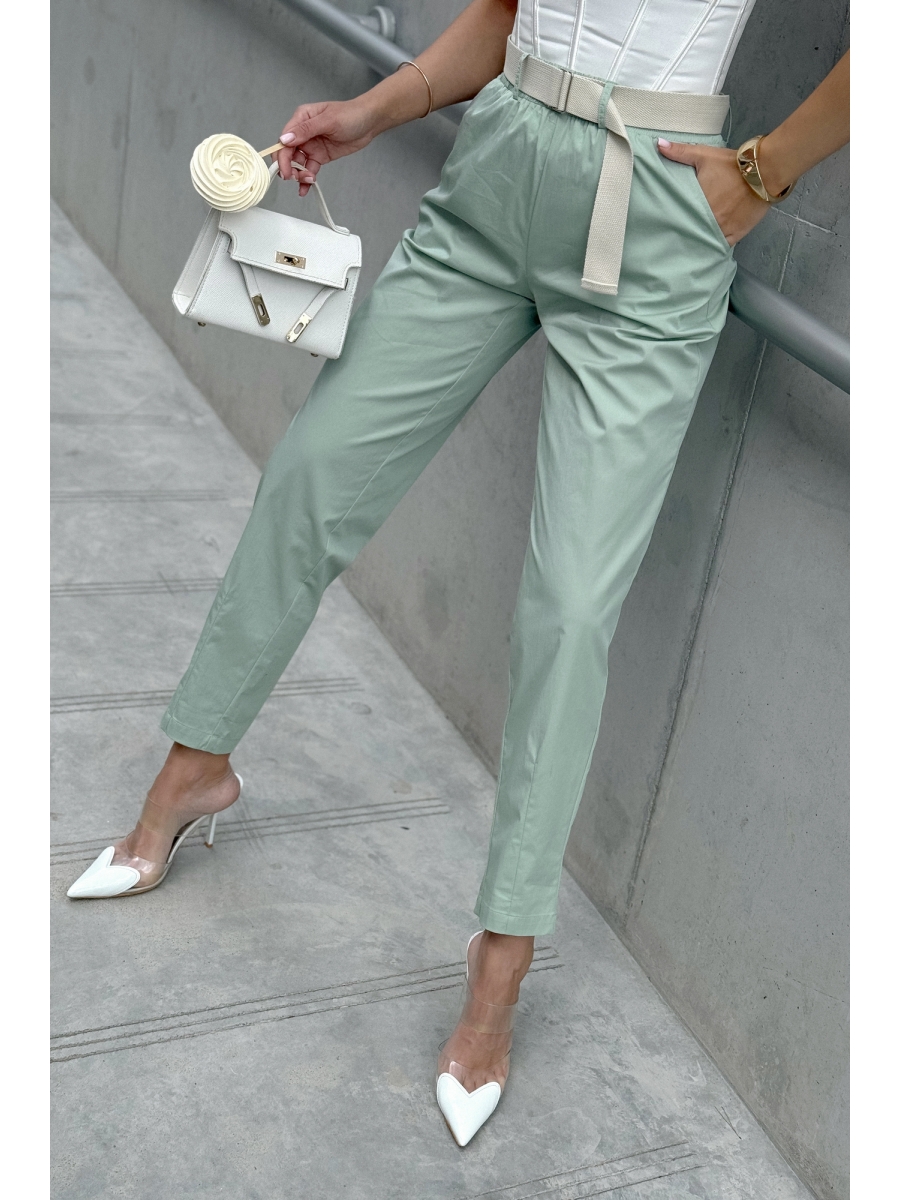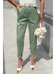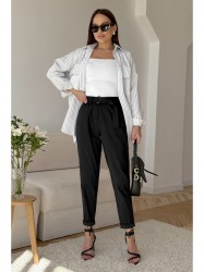 Брюки женские из текстильной ткани, слегка заужены к низу. В боковых швах расположены карманы. По низу передних половинок есть защип. Задняя половинка брюк с отрезной кокеткой и накладными карманами. Вверх брюк обработан поясом с резинкой (без молнии).