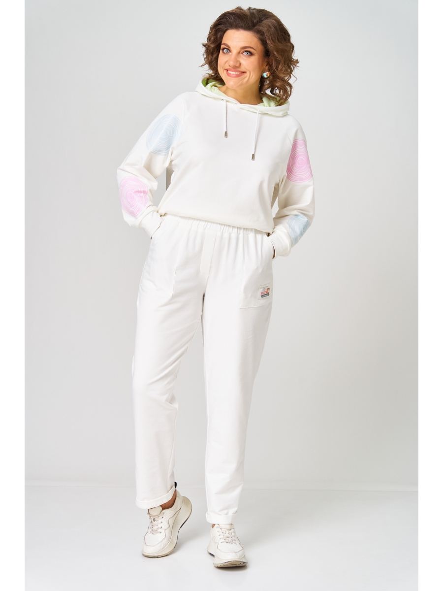 Брюки женские из трикотажной ткани (двунитка), слегка заужены к низу. По переду брюк расположены накладные карманы. На левом кармане настрочной декоративный элемент. В пояс вставлена резинка по кругу.