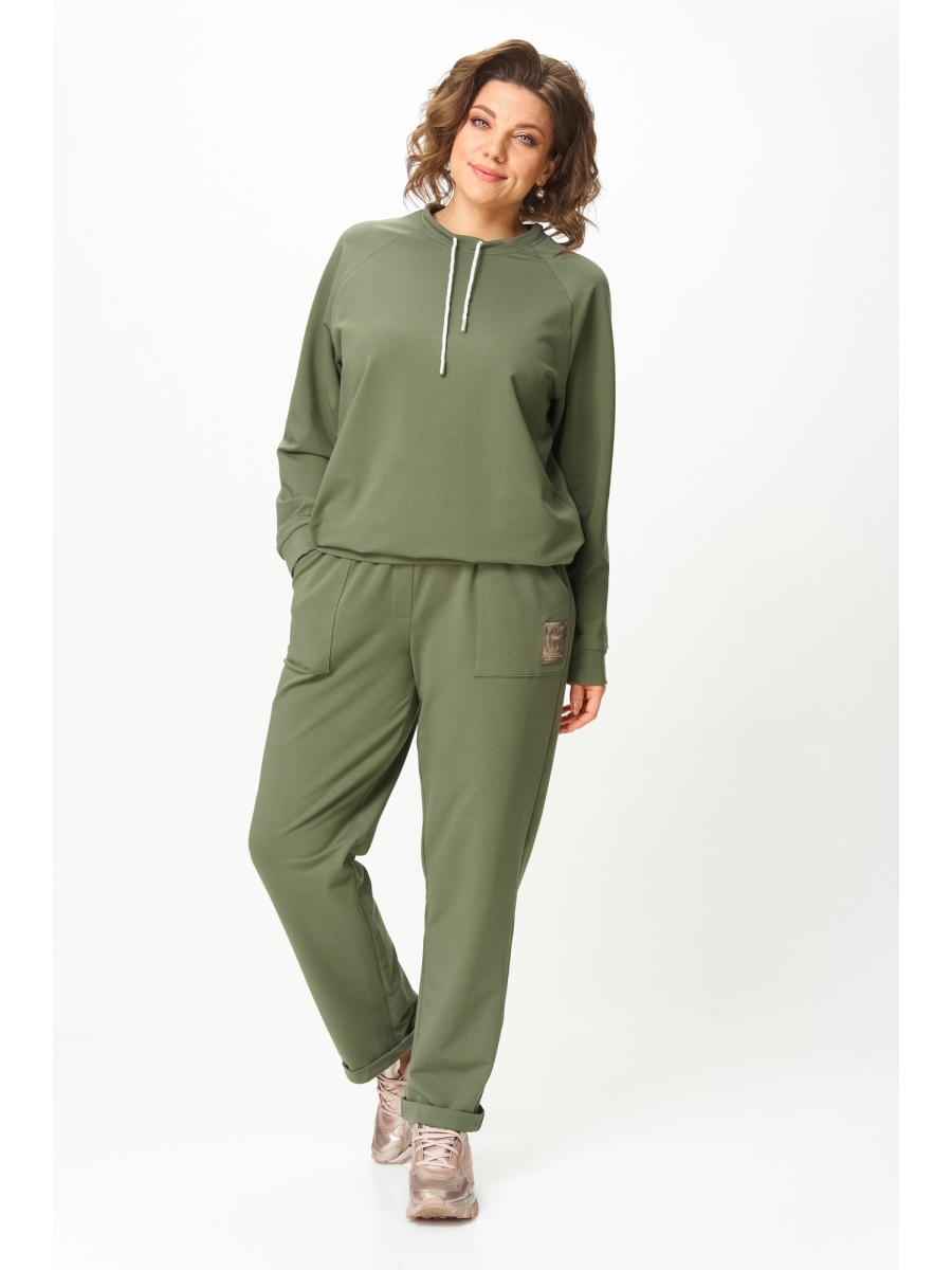 Брюки женские из трикотажной ткани (двунитка), слегка заужены к низу. По переду брюк расположены накладные карманы. На левом кармане настрочной декоративный элемент. В пояс вставлена резинка по кругу.