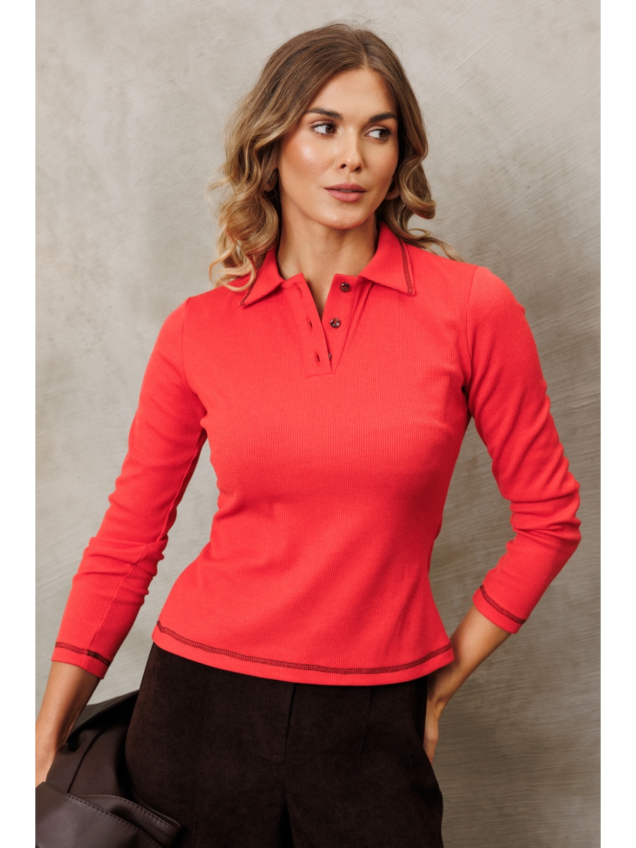 Джемпер приталенного силуэта с воротником поло из трикотажного полотна. Рукав втачной одношовный.