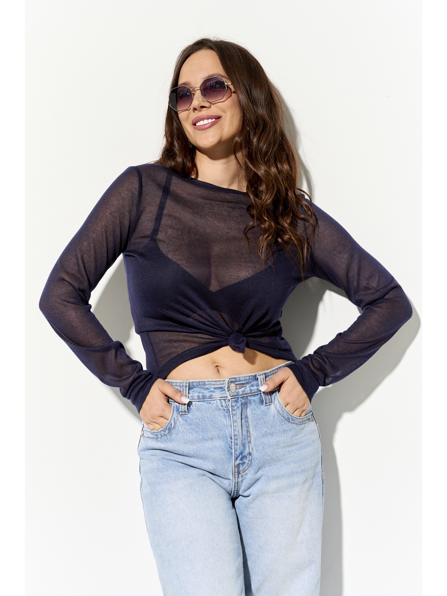 Женский джемпер полуприлегающего силуэта выполнен из мягкой полупрозрачной ткани с длинными рукавами. Джемпер имеет удлинённый фасон, позволяющий варьировать способы завязывания для создания многослойных образов.