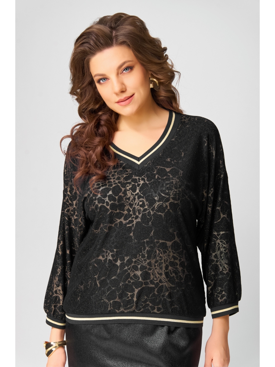 Нарядный джемпер ""Ираида"" свободного покроя выполнен из мягкого трикотажного полотна с декоративной сеткой, создающей эффект многослойности и воздушности. Спущенный рукав придаёт образу расслабленную элегантность, а V-образная горловина, обработанная довязом, подчёркивает линию шеи. Низ изделия и рукавов также оформлены довязом, что придаёт завершённость и аккуратность силуэту.