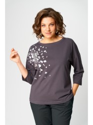 Джемпер женский из трикотажной ткани. По переду расположен принт. Спущенное плечо, рукав 3/4. Вырез горловины круглый, оформлен притачной бейкой.