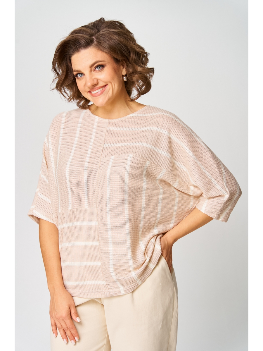 Джемпер женский из трикотажной вязаной ткани в полоску, свободного силуэта (летучая мышь). Перед и спинка джемпера обработаны декоративными подрезами. Рукав цельнокроеный. Вырез горловины круглый, обработан бейкой.