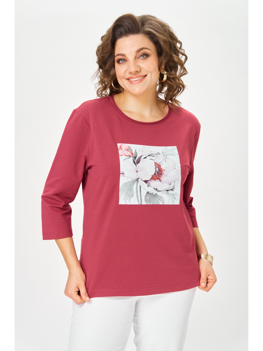 Джемпер женский из трикотажной хлопковой ткани (двунитка). По переду расположен принт. Рукав втачной 3/4, прямой. Вырез горловины круглый, оформлен бейкой с необработанными краями.