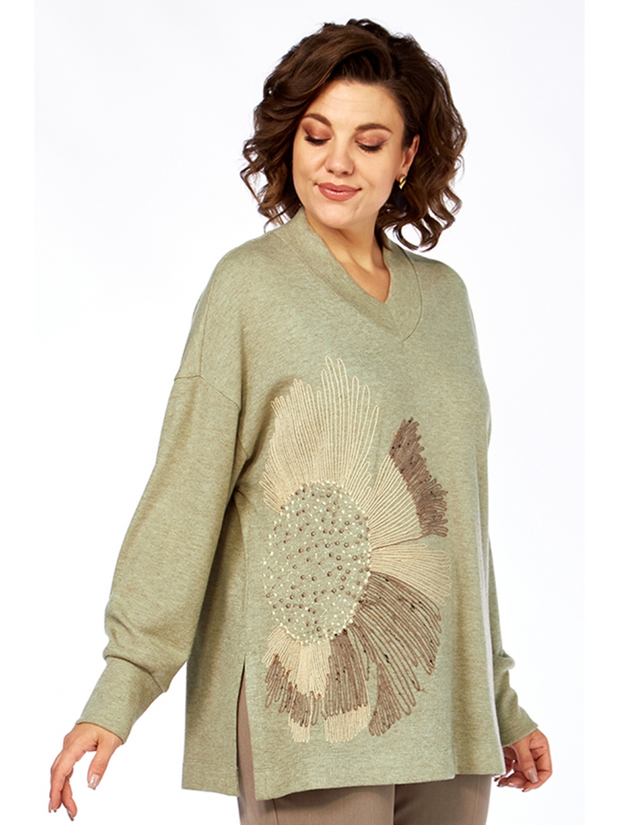 Джемпер свободного кроя, изготовлен из трикотажного полотна. Горловина V-образной формы. На полочке-вышивка. Спинка цельнокроенная. Рукава спущенные, с манжетами по низу. В боковых швах-разрезы.