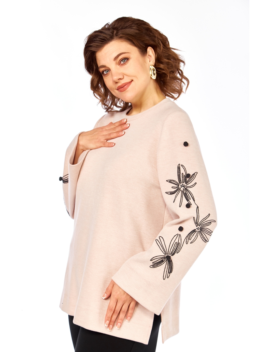 Джемпер женский, выполнен из трикотажного полотна. Перед и спинка цельнокроеные. Горловина круглой формы. Рукава втачные, декорированны вышивками и помпонами.