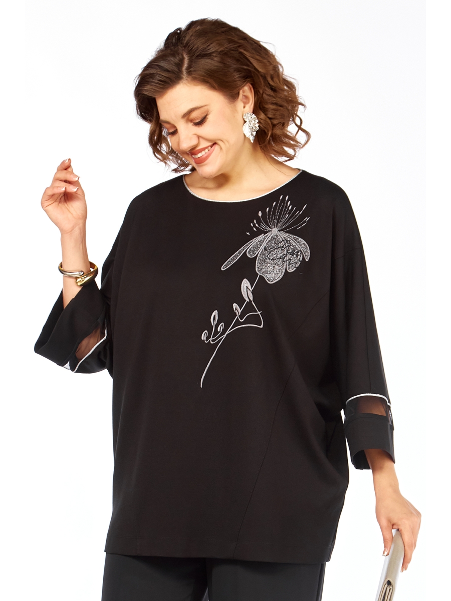 Джемпер женский, нарядный, свободного кроя. Перед разрезной, с дизайнерской вышивкой — аппликацией. Горловина круглой формы с кантом. Рукава цельнокроеные со вставками из сетки с кантом.