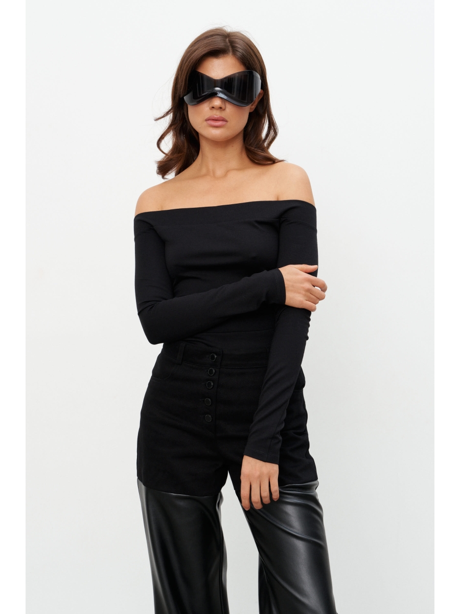 Джемпер из трикотажного полотна прилегающего силуэта с открытыми плечами. Отрезная деталь по верху изделия плотно фиксирует изделие на фигуре.