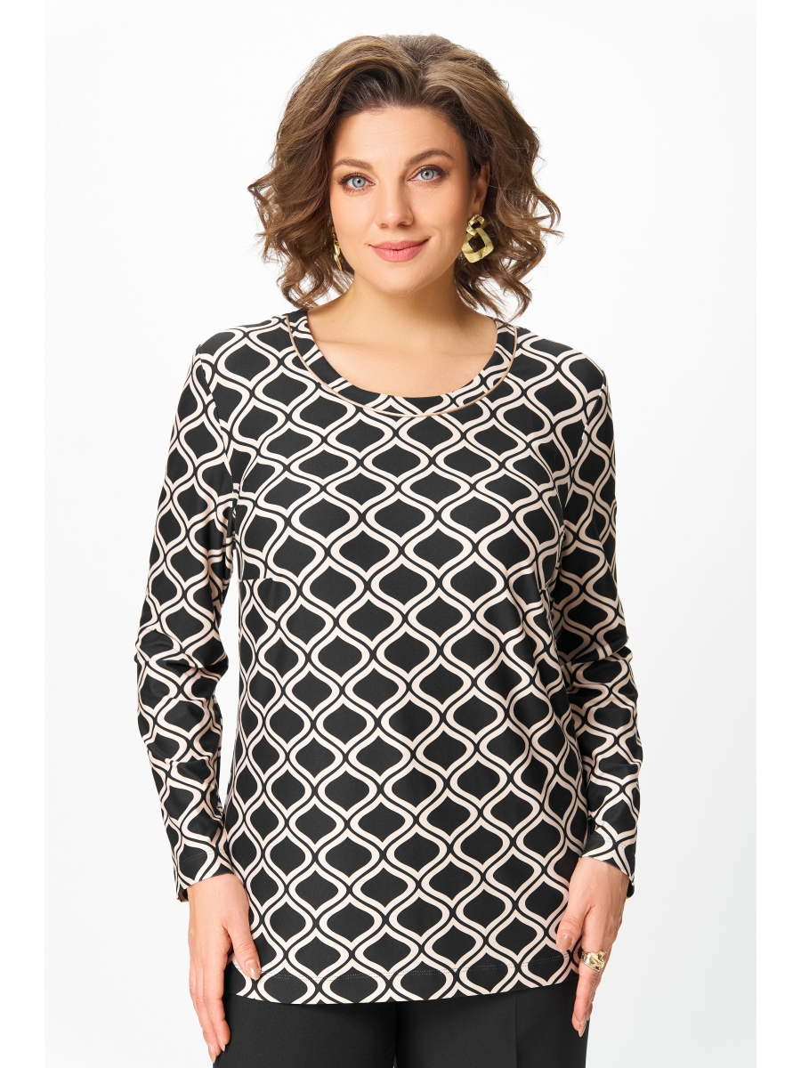 Джемпер из тонкого вискозного эластичного полотна. По переду нагрудные выточки, спинка с центральным швом. Горловина круглая, спереди обработана обтачкой с декоративным кантом. Рукав втачной, длинный.