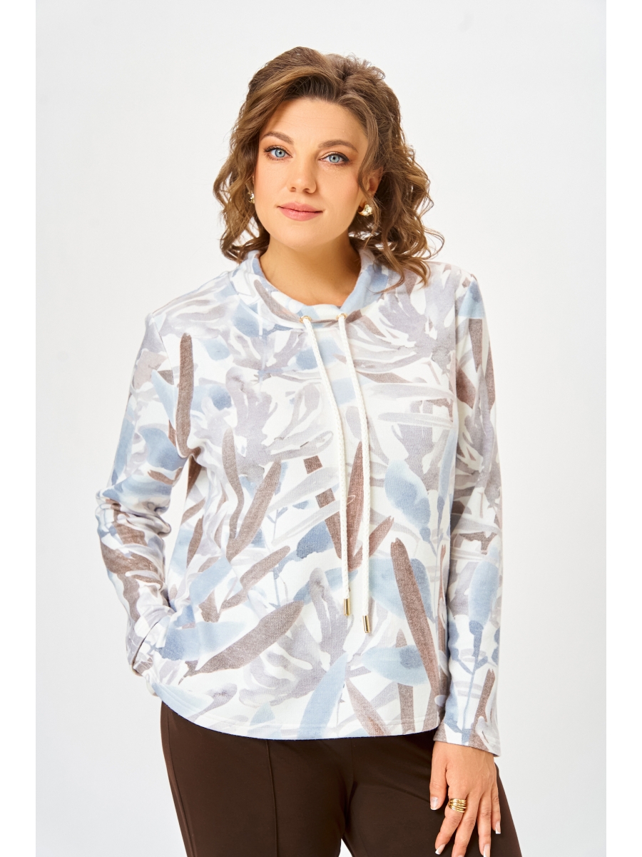 Джемпер из мягкого вискозного трикотажного полотна прямого силуэта, слегка расширен к низу. Перед и спинка цельные, в боковых швах разрезы длиной 11 см. Форма горловины круглая, обработана воротником-стойкой с люверсами, через которые втянут декоративный шнур с металлическими наконечниками. Рукав втачной одношовный длинный.