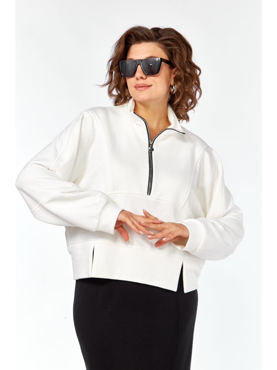 Джемпер: свободного кроя, линия плеча спущена. Воротник мягкий стойка, застёжка на металлическую тесьму молнию. Низ джемпера обработан широкой бейкой с разрезами. Спинка с декоративными подрезами и металлической нашивкой.