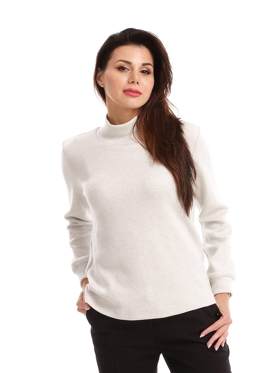 Блуза прямого покроя выполнена из мягкого трикотажного полотна, рукав втачной одношовный, заканчивается манжетой. Воротник стойка, блуза без застежки.