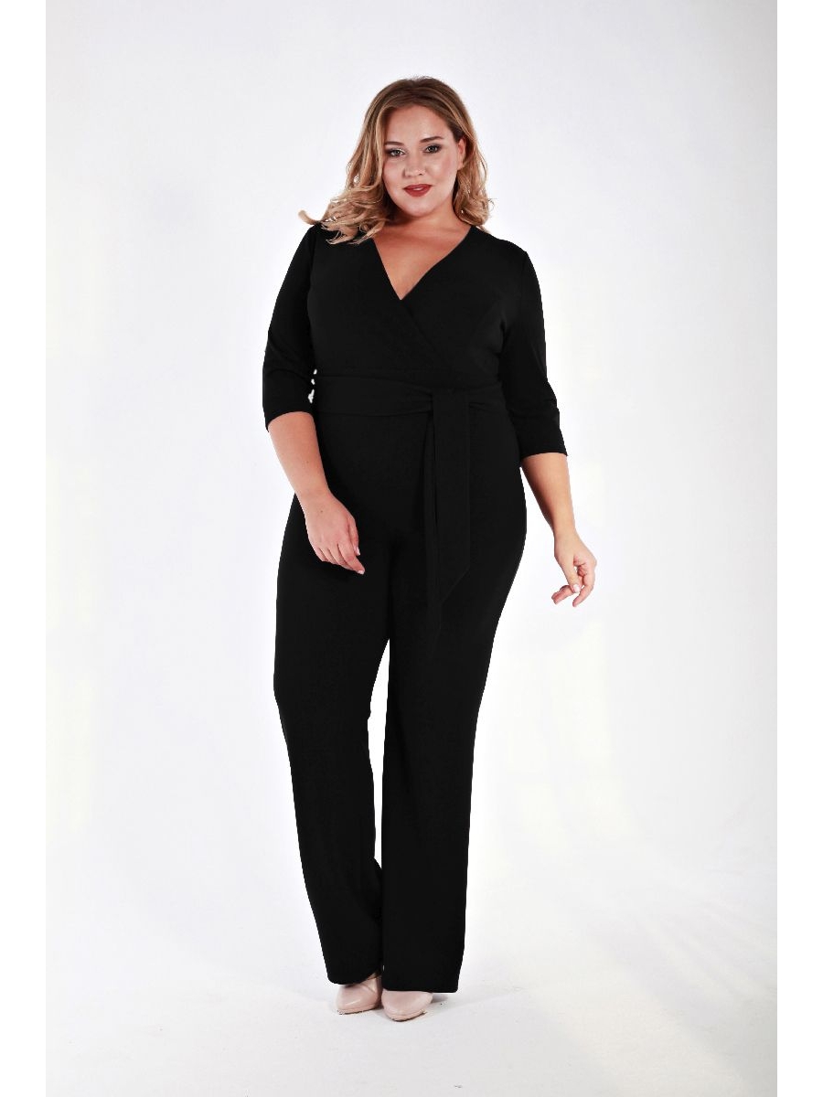 Комбинезон из крепа с эластаном прилегающего силуэта. Верхняя часть переда с запАхом, отрезной под грудью. Брюки прямые. Завязывается на пояс.