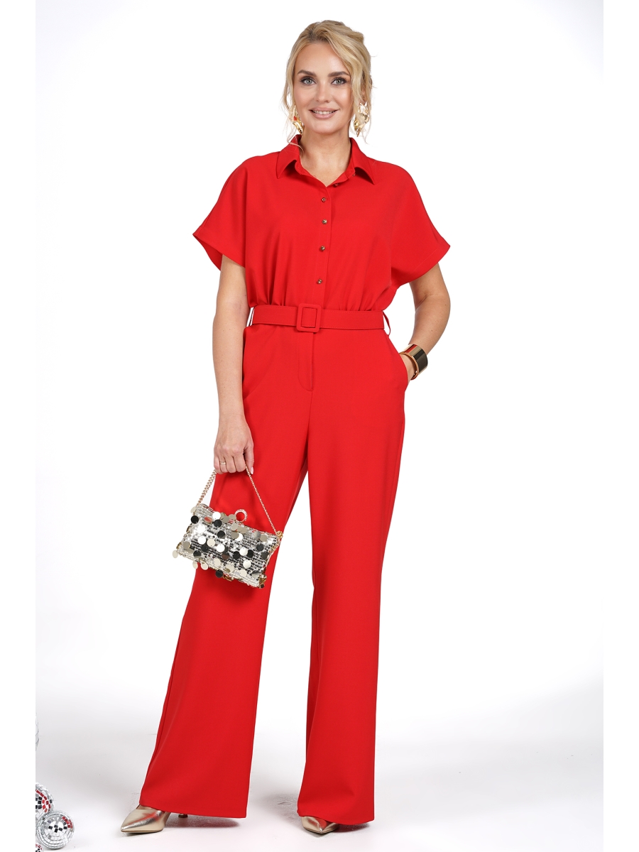Комбинезон женский отрезной по линии талии, со спущенной линией плеча, со съёмным ремнём продергивающийся через шлёвки по боковым. Лиф переда с застёжкой на петли, пуговицы, по линии талии сборка.