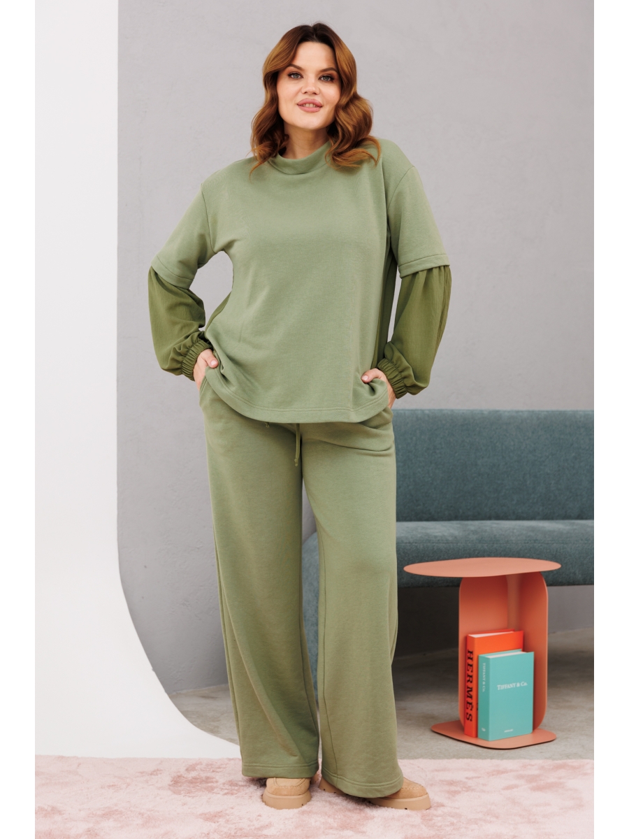 Джемпер прямого силуэта со спущенным плечом. Полочка трикотажная. По спинке идет отрезная кокетка и вставка из отделочной ткани со встречной складкой по центру, низ фигурный. Воротник - стойка. По рукаву идет подрез из отделочной ткани. Сверху по подрезу сборка, низ рукава на резинке.