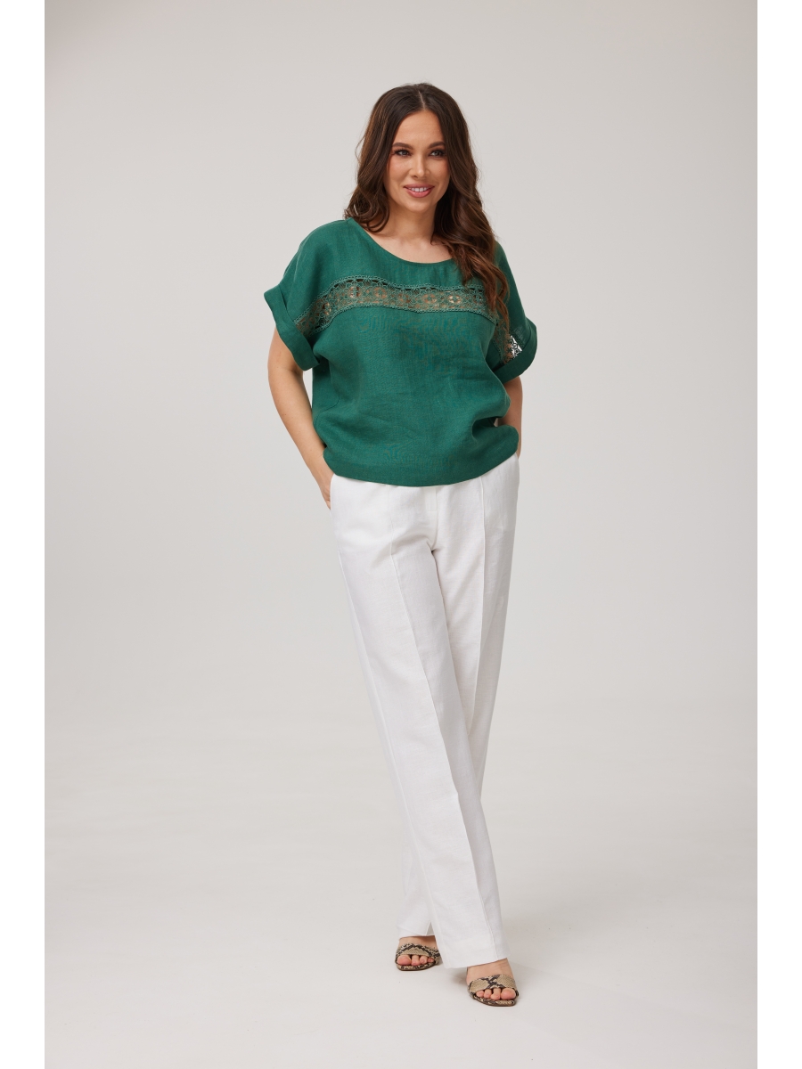 Эффектная блузка изготовлена из качественного мягкого льна с эффектом мятости свободного силуэта. Горловина оканотована. По плечу и переду проходит отделка тесьма-шитьё из хлопка, рукав кимоно.