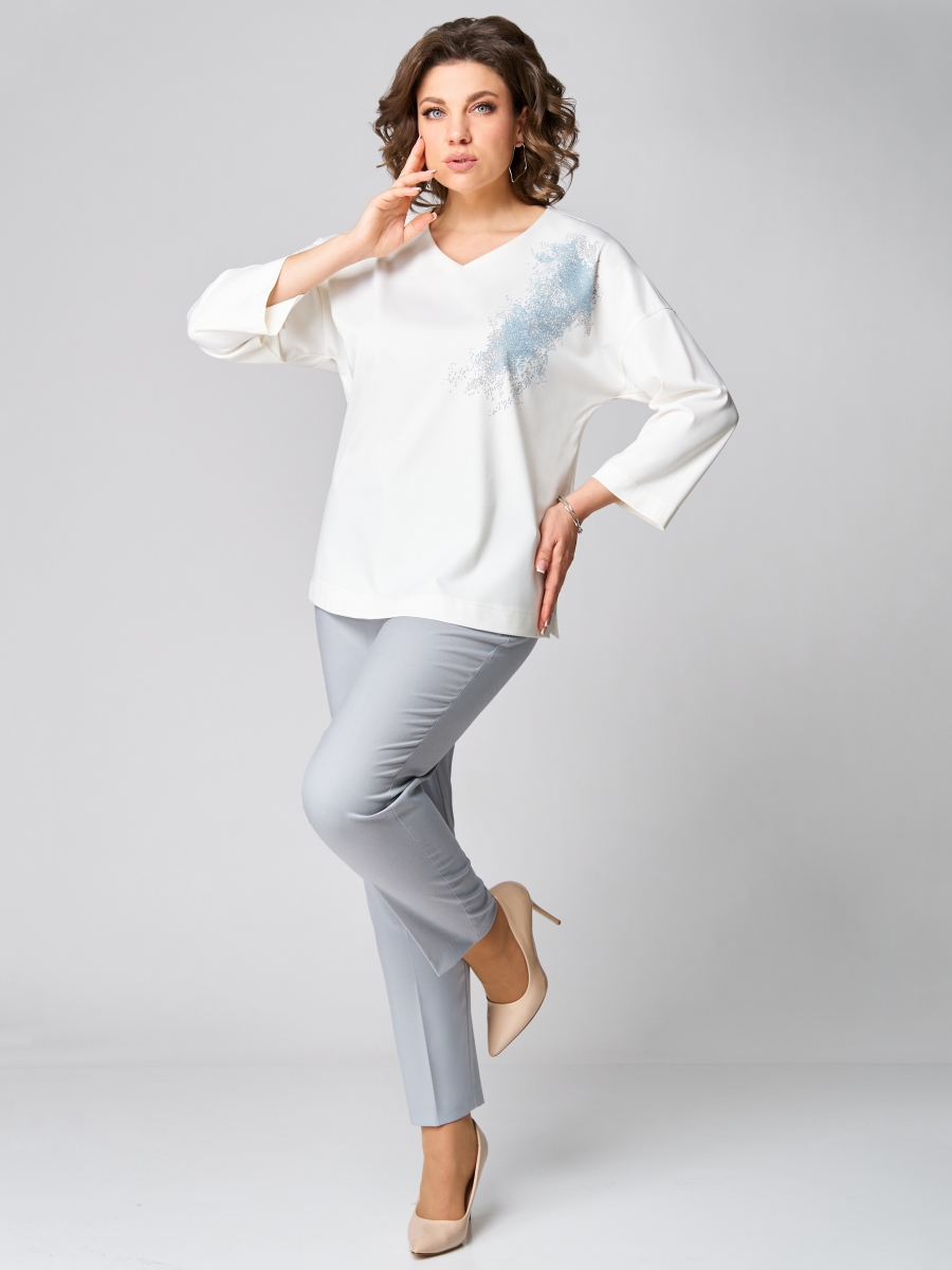 Брюки прямые, застежка на тесьму-молнию в гульфике и пуговицу по центру переда. Пояс притачной с эластичной тесьмой в боковых швах брюк, которая обеспечивает максимально комфортную посадку на любой тип фигуры.