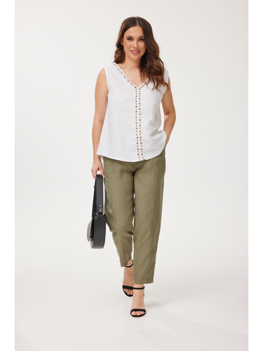 Эффектная блузка изготовлена из качественного натурального льна с эффектом мятости свободного силуэта. По переду и горловине проходит отделка-тесьма из хлопка. Низ асимметричен.