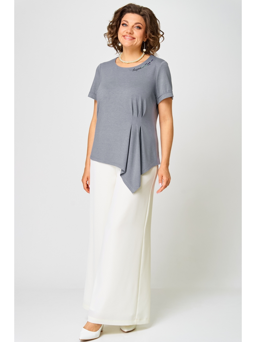 Блузка из тонкого однотонного трикотажного полотна с элегантными защипами по талии подчеркнет Вашу женственность и романтичность. Удлиненную блузку дополняют комфортные брюки свободного силуэта из струящегося шифона, которые помогут скрыть недостатки и вытянуть фигуру.