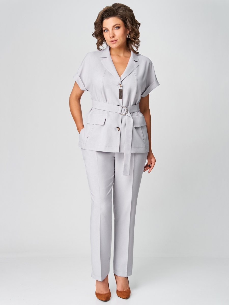 Брюки прямые, застежка на тесьму-молнию в гульфике и пуговицу по центру переда. Пояс притачной с эластичной тесьмой в боковых швах брюк, которая обеспечивает максимально комфортную посадку на любой тип фигуры. По боковому шву внизу разрезы.