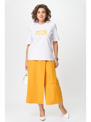 Брюки-кюлоты с элегантным запахом, свободной посадки, брючины широкие укороченные, чуть выше щиколотки. По переду молния, сзади по поясу вставлена резинка, запах фиксируется поясом на пряжки.