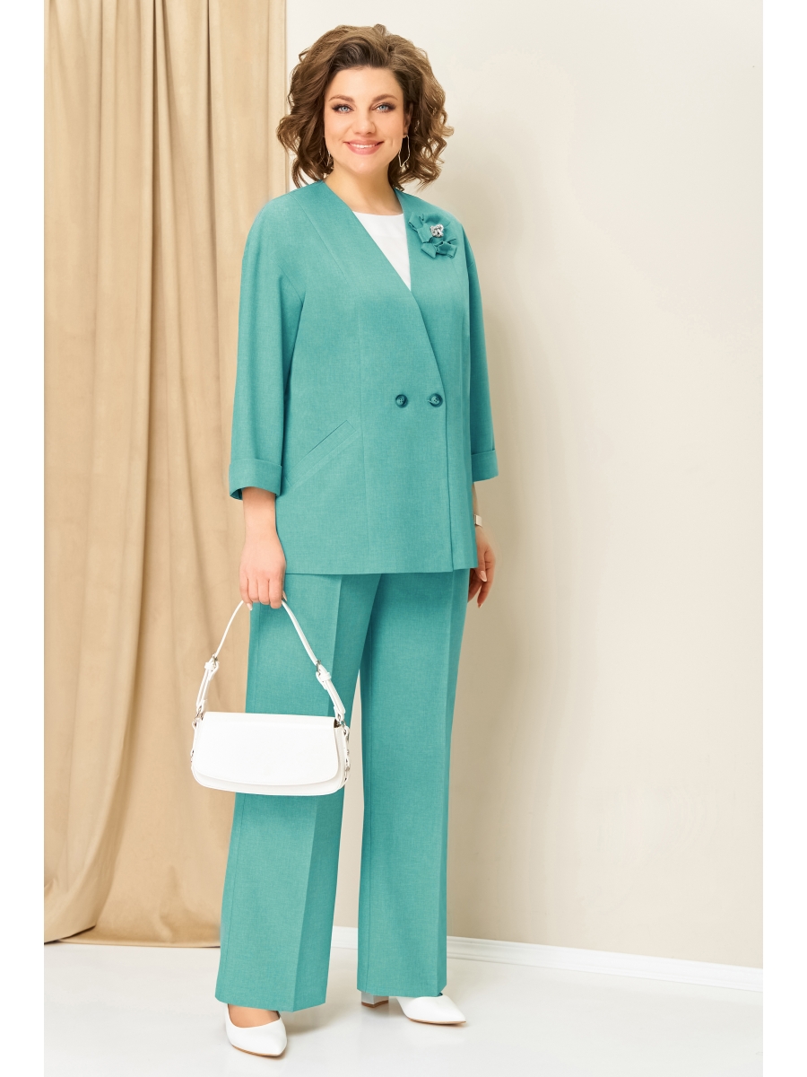 Стильный двубортный жакет из текстиля прямого силуэта с карманами и V-образной горловиной. Полочки жакета на подкладке. По бокам жакета- неглубокие разрезы. Рукав спущенный с подворотом по низу.