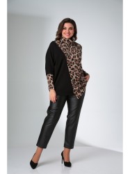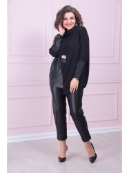 Туника прямого силуэта, скомбинирована из трикотажной ткани и экокожи. Горловина расширена, воротник хомут. Рукав цельнокроеный. Низ туники фигурный. Спинка трикотажная, со средним швом полочке, так и по спинке.