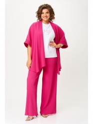 В его состав входит стильный кардиган из плиссированного однотонного трикотажа с распашной застежкой, коротким цельнокроеным рукавом с притачной манжетой и фигурным низом, а также длинные брюки-палаццо на эластичном поясе с резинкой — комфортные и модные.