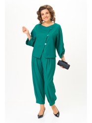 Универсальный костюм, который выглядит дорого и современно, но при этом дарит комфорт и лёгкость. Его можно носить как комплект или по отдельности: жакет с асимметричной застёжкой и акцентными пуговицами легко сочетается с джинсами, а брюки свободного кроя идеально смотрятся с блузой или футболкой.