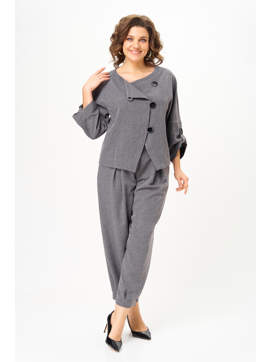 Универсальный костюм, который выглядит дорого и современно, но при этом дарит комфорт и лёгкость. Его можно носить как комплект или по отдельности: жакет с асимметричной застёжкой и акцентными пуговицами легко сочетается с джинсами, а брюки свободного кроя идеально смотрятся с блузой или футболкой.