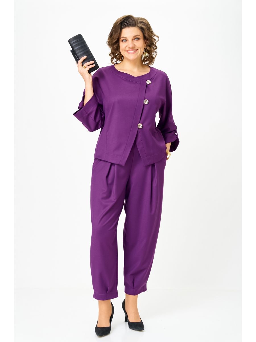 Этот костюм создан для женщины, которую невозможно не заметить. Глубокий пурпур — насыщенный, благородный, притягивающий взгляд — делает образ выразительным и статусным. Асимметричная застёжка топа добавляет характер и позволяет играть с настроением: носить застёгнутым как самостоятельный акцент или распахнутым — как лёгкий жакет поверх блузы или топа.