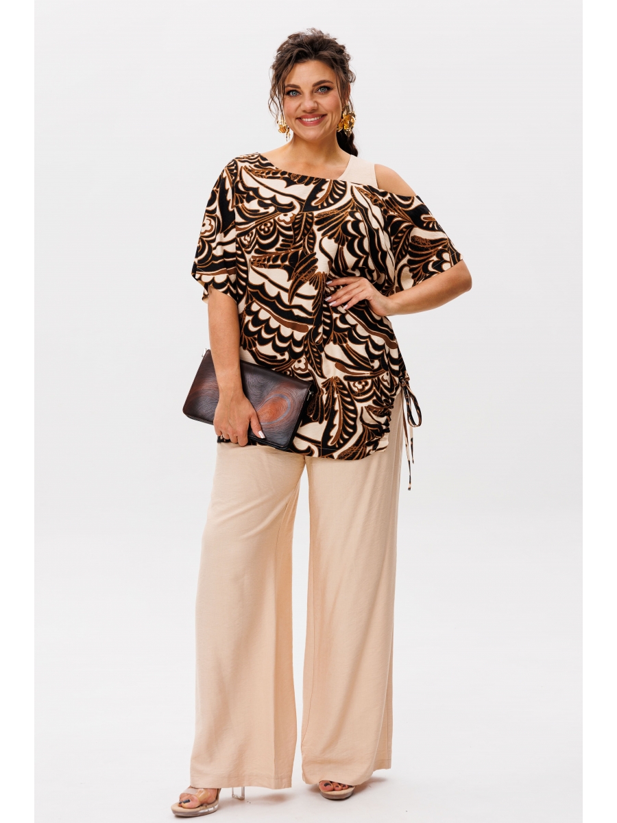 Принт «латте с фундуком» словно всплеск красок на холсте, превращает костюм в произведение искусства. Каждая деталь продумана так, чтобы блузу и брюки можно было легко комбинировать с другими вещами — ансамбль звучит гармонично как в дуэте, так и соло.