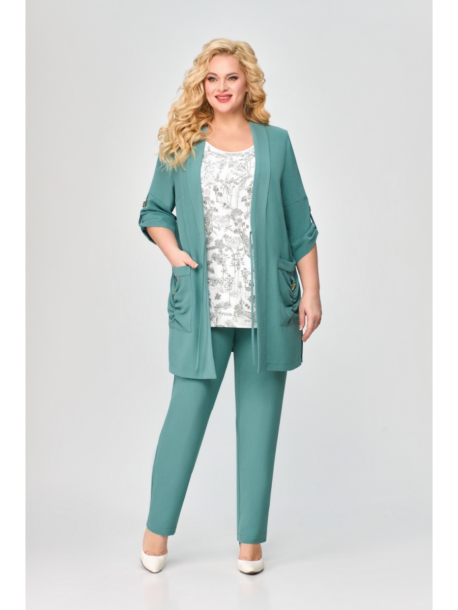 Костюм женский, состоящий из жакета, топа и брюк, из легкой ткани.
