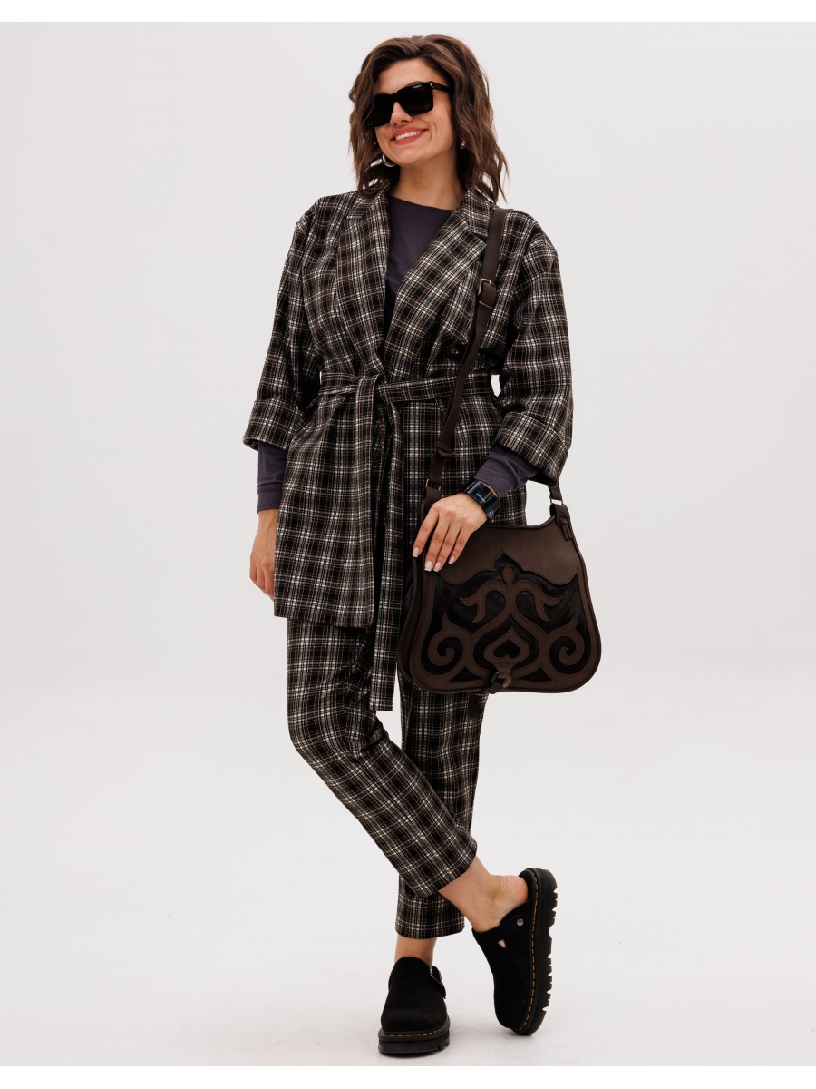 Костюм из утеплённого трикотажного полотна, выполненный в цвете «каштановая история» с классическим клетчатым принтом. Этот актуальный предмет гардероба обладает вневременной притягательностью, оставаясь стильным независимо от сменяющихся тенденций.