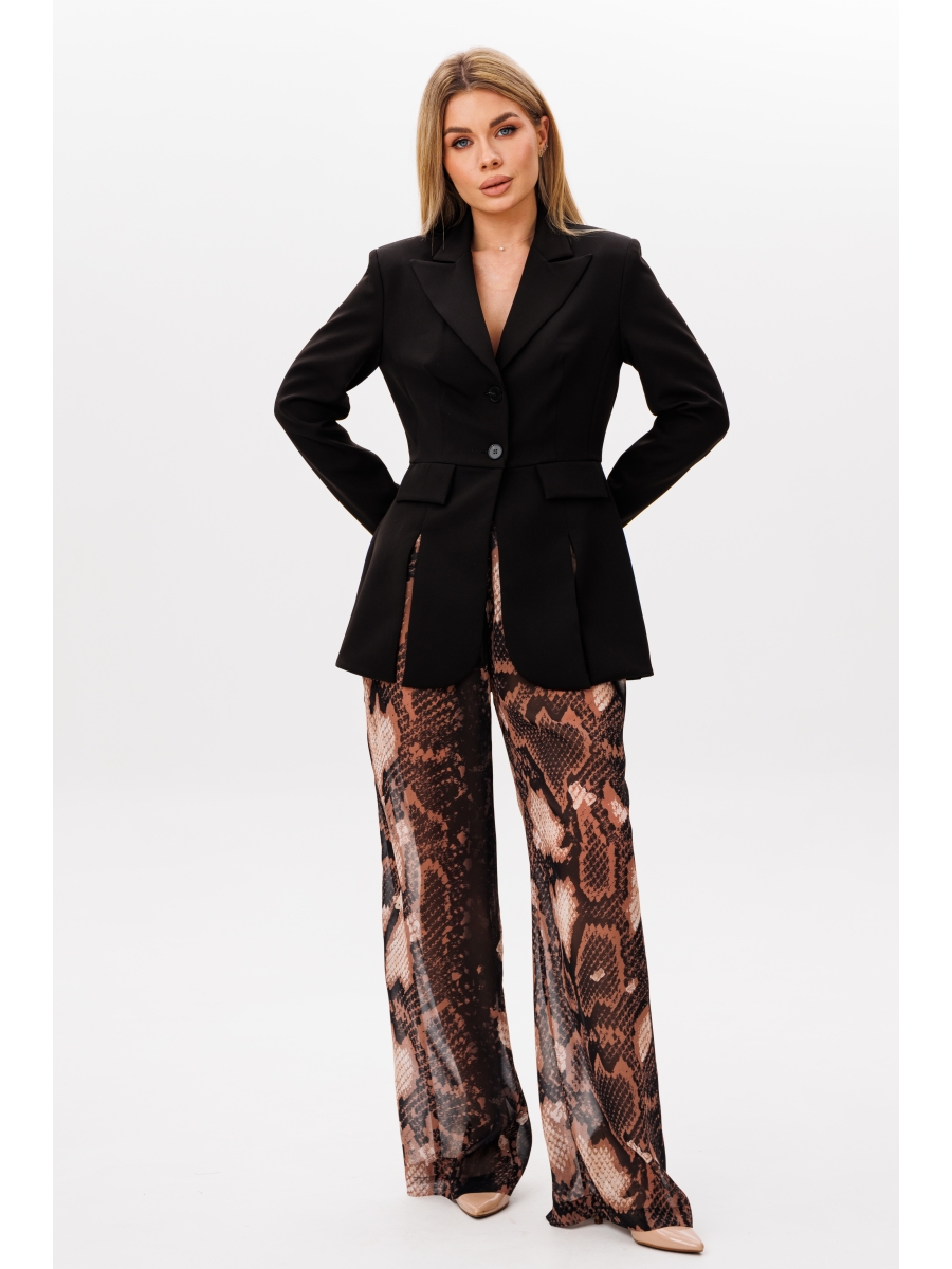Жакет женский прилегающего силуэта, отрезной по линии талии. По переду в нижней части жакета разрезы. По линии талии декоративные клапаны. Рукав втачной длинный. Жакет на подкладке.