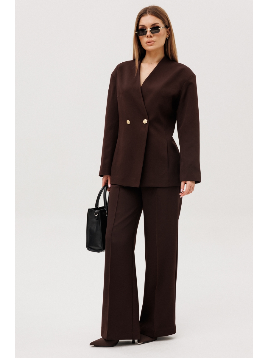 Элегантный женский костюм насыщенного шоколадного цвета, создающий строгий, но выразительный образ.